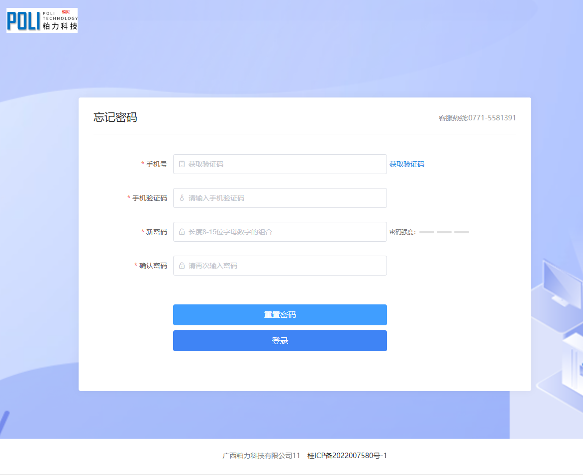 进入粕力平台登录页面,点击右下角的小字“忘记密码”。