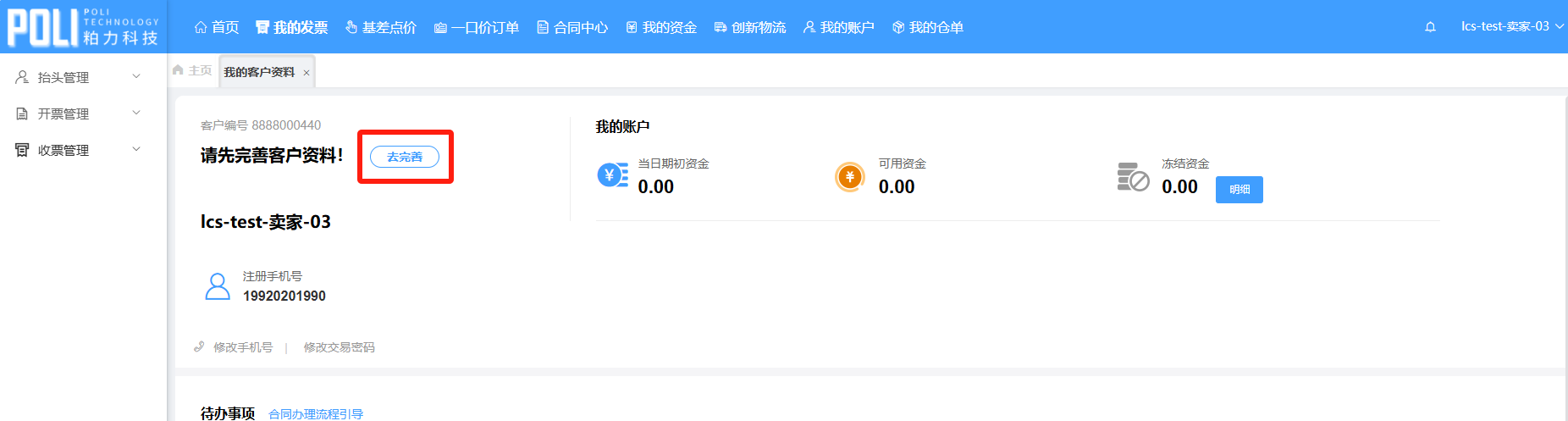 请依次打开我的资金->账户中心->开票信息维护并填写相关内容。