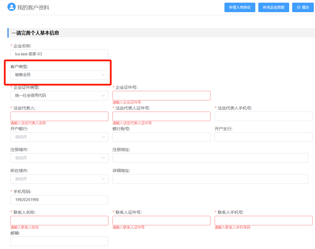 客户类型字段中,销售方选择销售会员,采购方选择采购会员。 - 点击