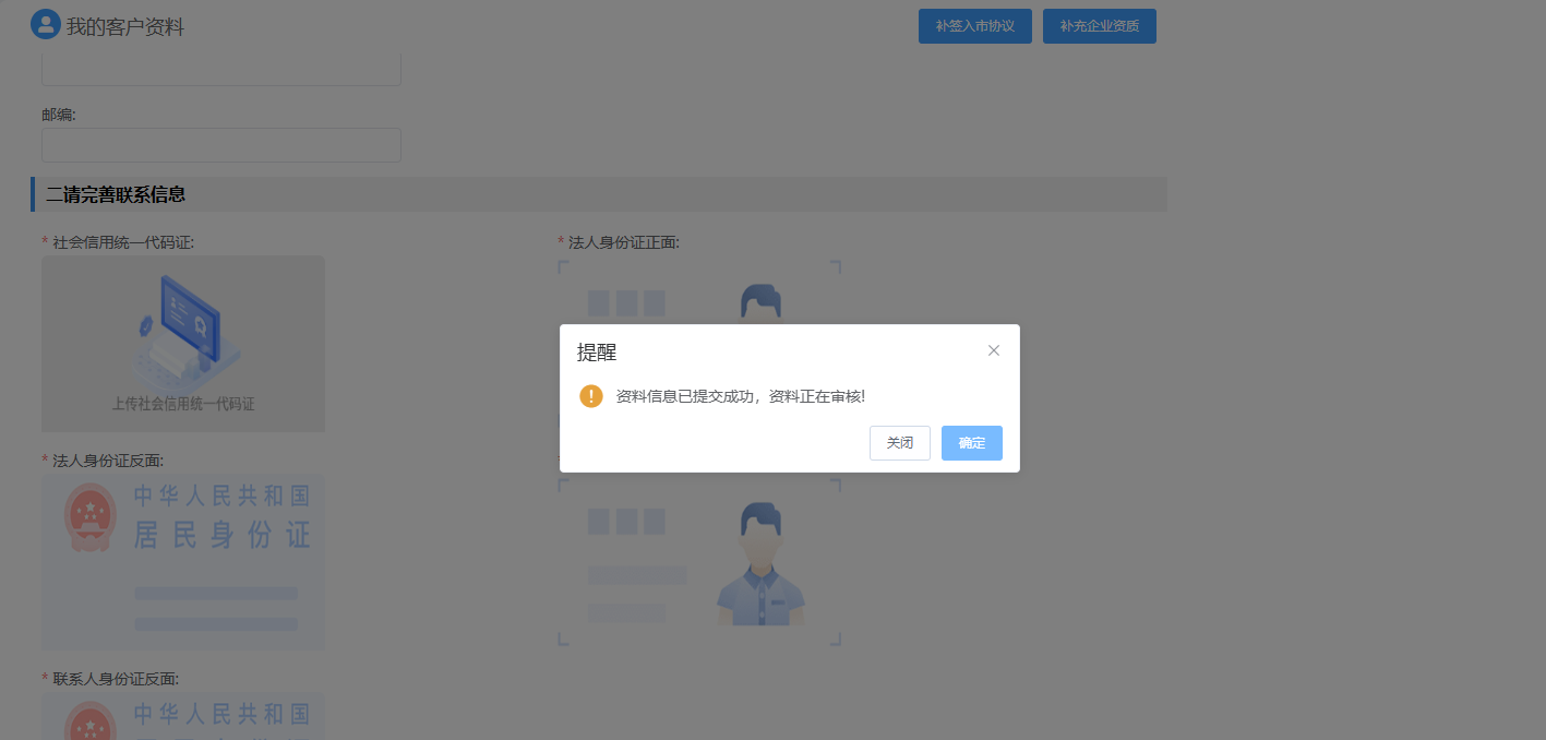 完成上述信息填写后,请等待平台后台管理员审核。若需进行挂摘牌交易,请联系平台管理员进行入金操作。